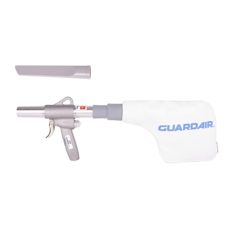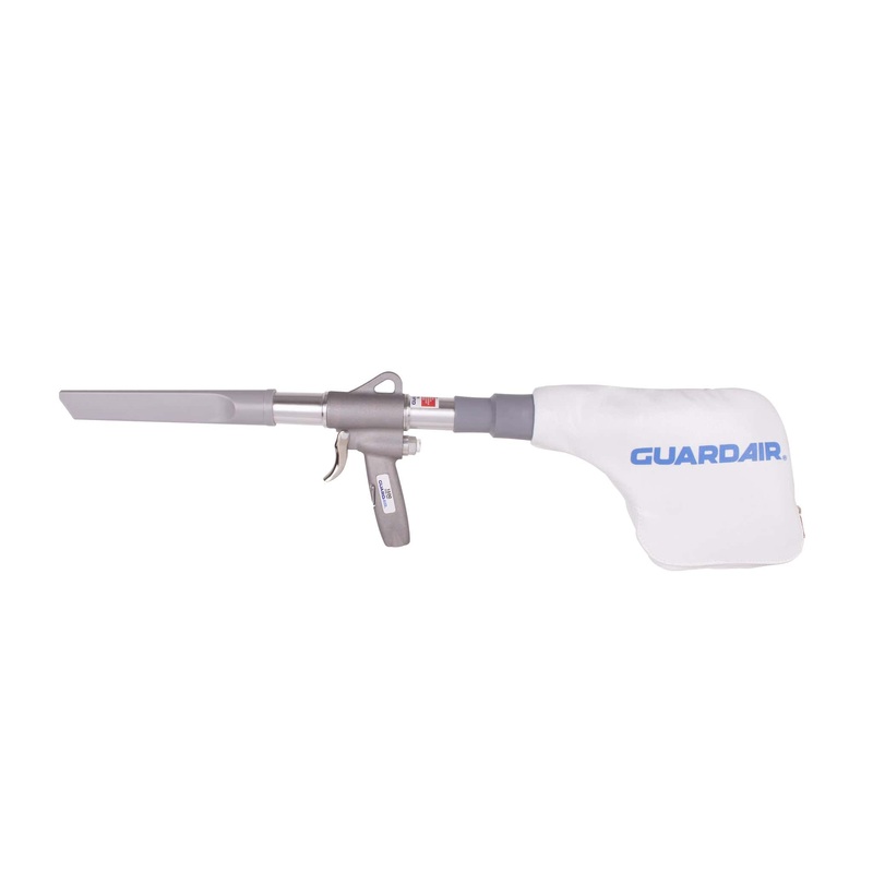 Twice the power of a standard shop vacuum in the palm of your hand. Powered by standard shop compressed air, the lightweight 1500 GunVac has no electric motors to burn out. Easy to empty, high filtration collection bag attaches to rear of vacuum via hose cuff. Tapered vacuum inlet accepts all standard 1-1/4″ vac accessories. GunVac hangs on a hook, ready for use at any time.