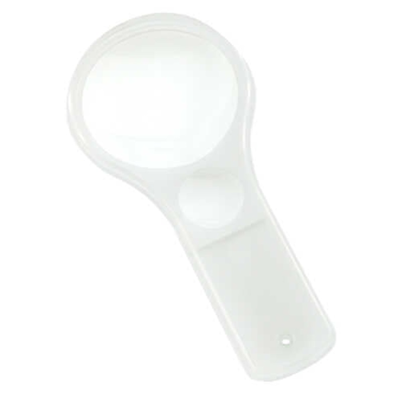 Dual lens magnifier has 3x and 6x magnifications. 50mm diameter. Hole in handle for attaching a lanyard.