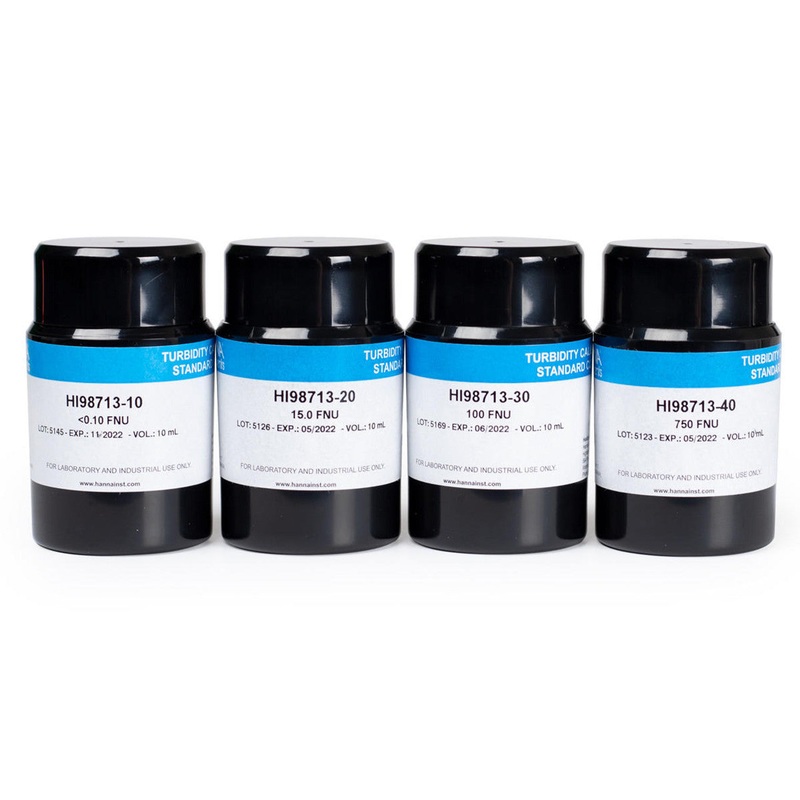 The HI98713-11 Turbidity Calibration Standards contains four standard values of <0.1, 15, 100 and 750 FNU. These values cover a full range of turbidity measurements from ultra-low up to mid-range values.