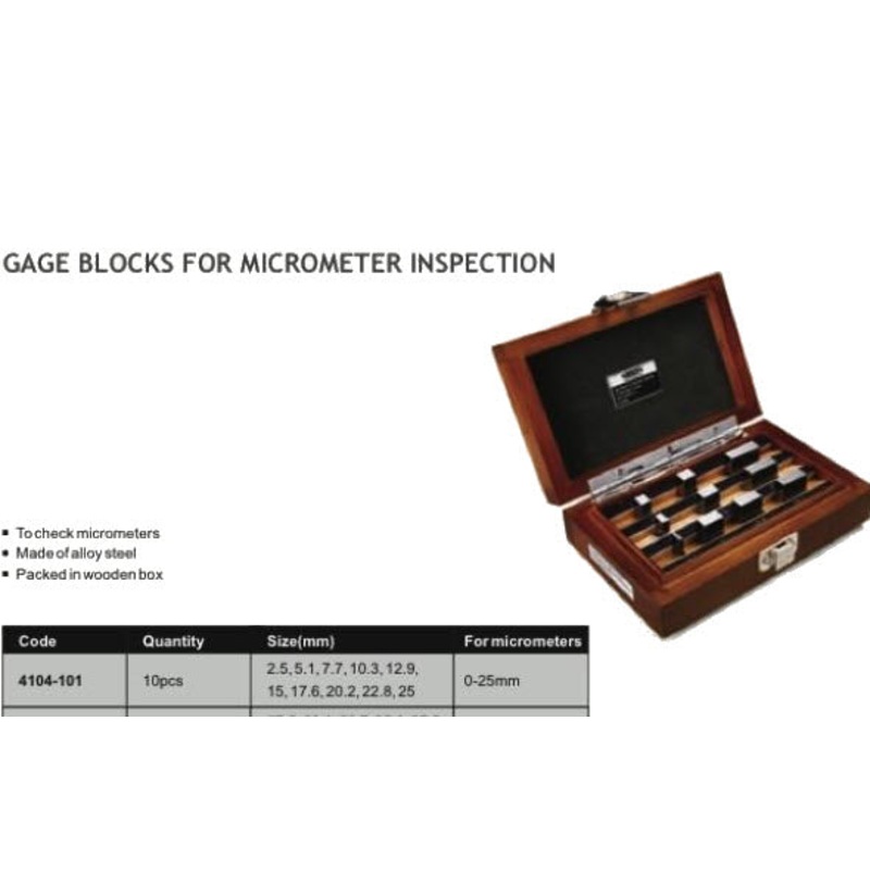 Insize Gauge Block set 4104-10-1 or checking 0-25mm Micrometers Set of gauges for checking micrometer accuracy for 0-25mm micrometers. Technical specification: Quantity: 10pcs Grade 0 Meet ISO 3650