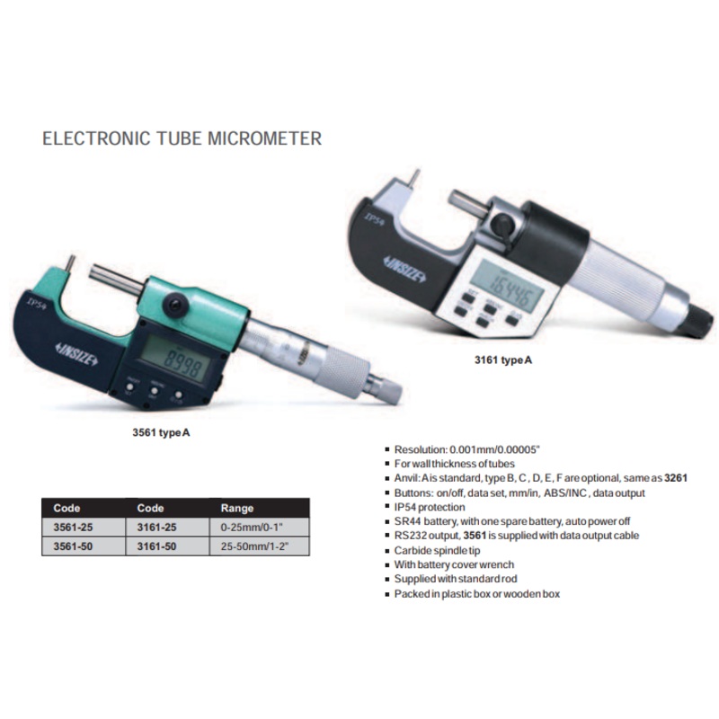 Insize Digital Tube Micrometer 3161-25 Range 0-1″/0-25mm x .00005″/.001mm