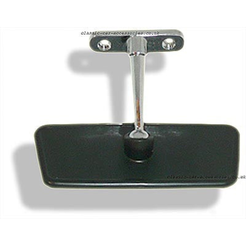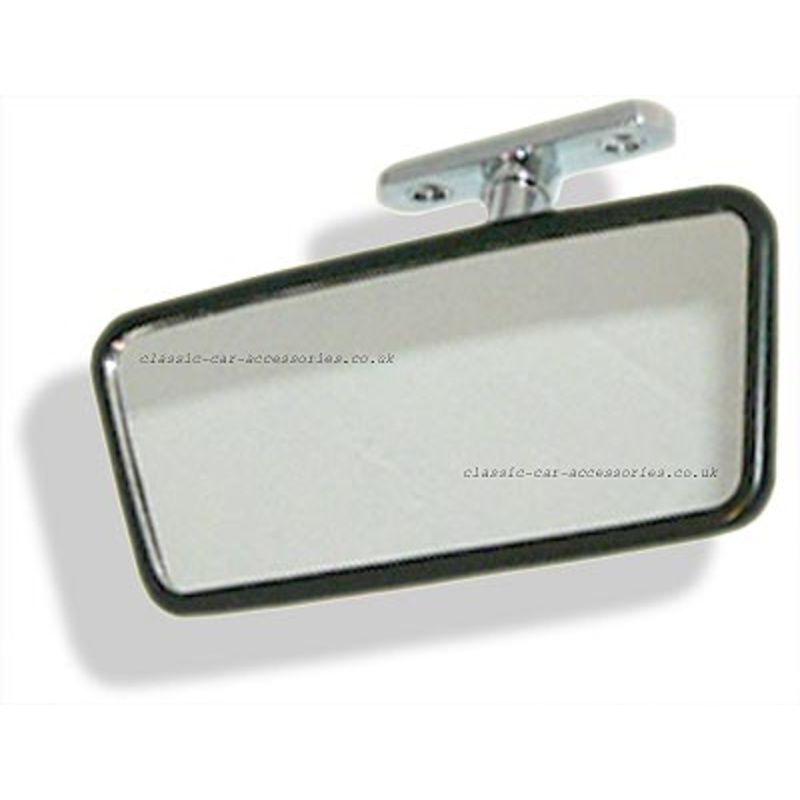 Interior mirror with black plastic head 125mm tapering to 110mm x 55mm (5″ x 4″ x 2″) with a diecast chrome stem. The base is 58mm x 16mm and the fixing holes are 39mm apart.