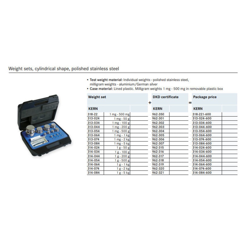 Kern 314-064 E2 Weight Sets 1g-1Kg in a lined plastic case Cylindrical shape, polished stainless steel Dust-brush, tweezers and gloves to handle the weights included