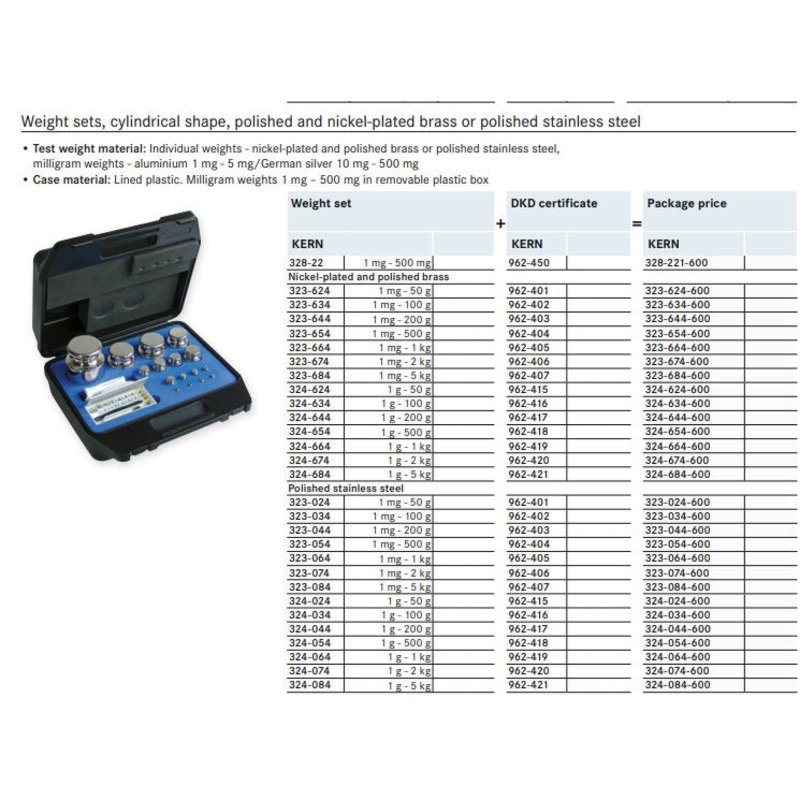 Kern 324-074-600 F1 Sets 1g-2Kg are in a plastic case Cylindrical shape, polished stainless steel Dust-brush, tweezers and gloves to handle the weights DKD calibration certificate included