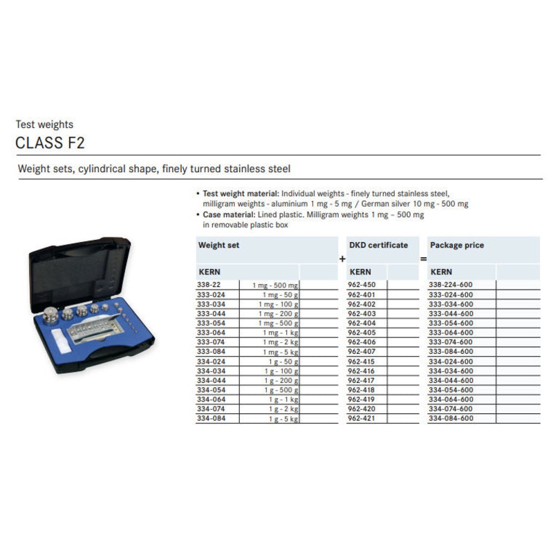 Kern 334-074-600, Kern F2 Sets 1g-2Kg in a plastic case Cylindrical shape, polished stainless steel Dust-brush, tweezers and gloves to handle the weights. DKD Certificate of Calibration Included