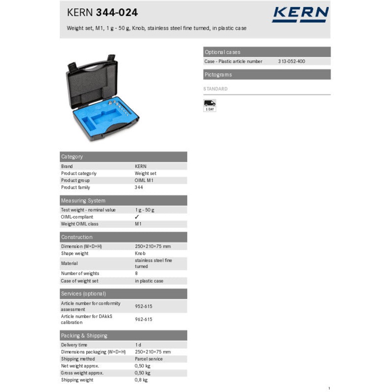 Kern 344-024, Kern M1 Sets 1g – 50g in a plastic case Cylindrical shape, polished stainless steel Dust-brush, tweezers and gloves to handle the weights. DKD Certificate of Calibration Included (Copy)