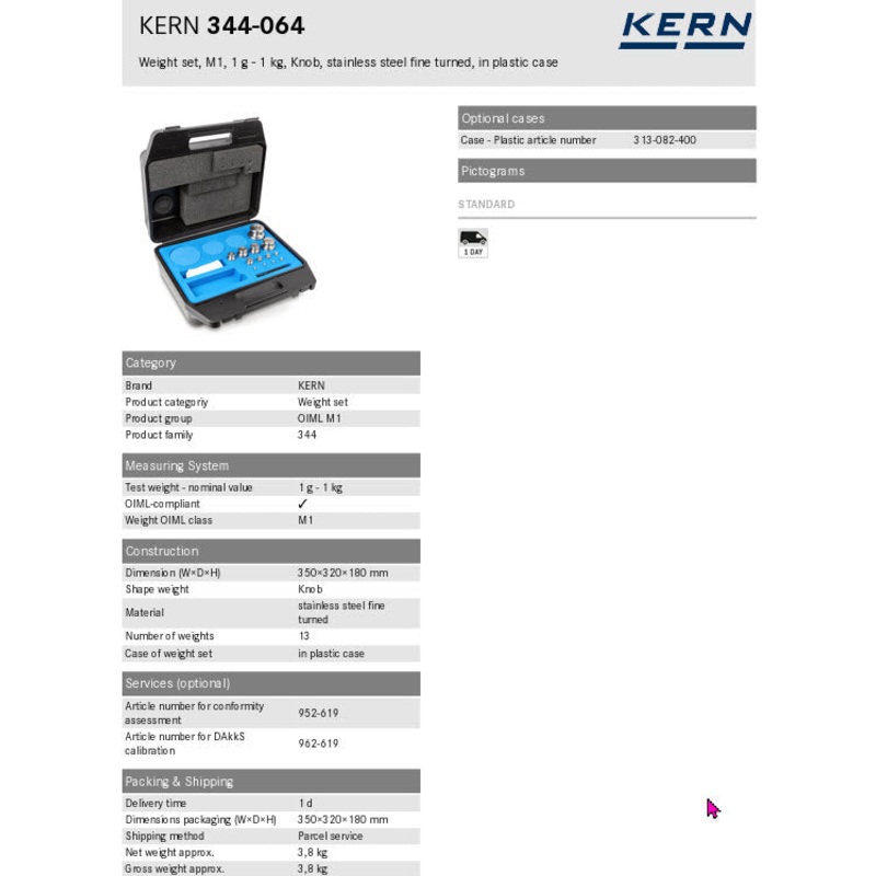 Kern 344-064-600, Kern M1 Sets 1g – 1Kg in a plastic case Cylindrical shape, polished stainless steel Dust-brush, tweezers and gloves to handle the weights.