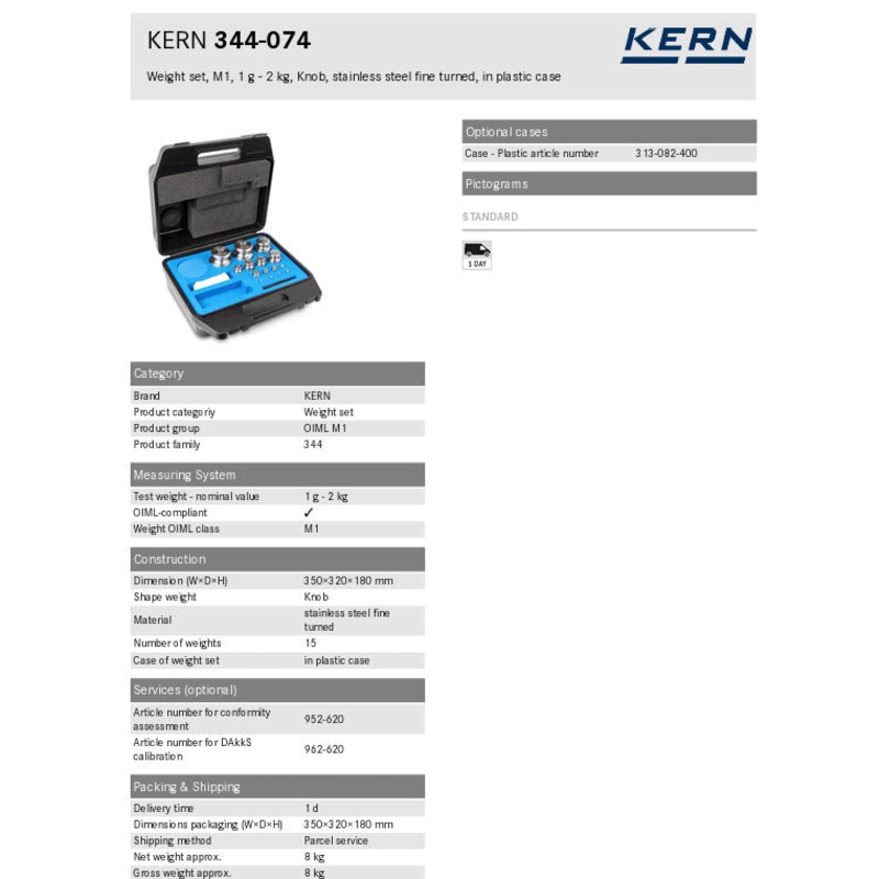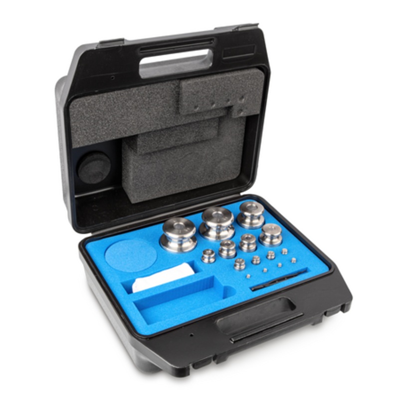 Kern 344-074-600, Kern M1 Sets 1g – 2Kg in a plastic case Cylindrical shape, polished stainless steel Dust-brush, tweezers and gloves to handle the weights. DKD Certificate of Calibration Included