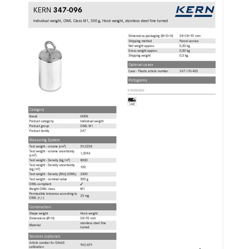 Kern 347-096 500g Individual weight, OIML Class M1, 500 g, Hook weight, stainless steel fine turned