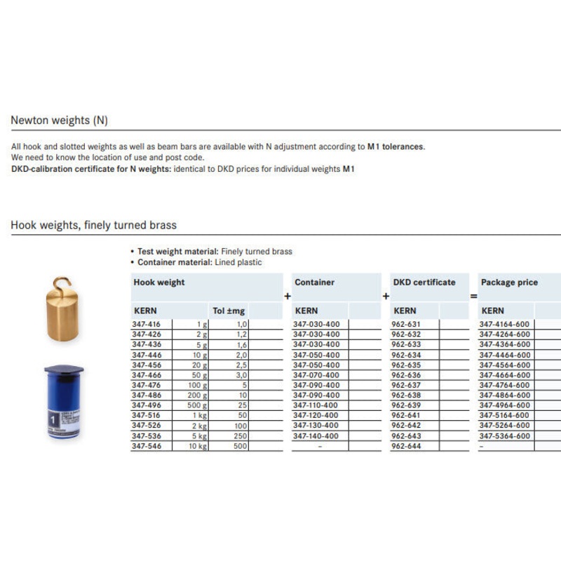Kern 347-4264-600 M1 finely turned brass hook weights in a Wooden Box with DKD Calibration Certificate, Weight 2g Tolerance +/-1.2mg