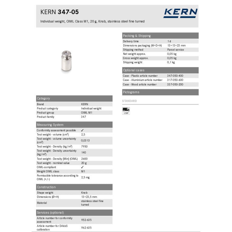 Individual weight, OIML Class M1, 20 g, Knob, stainless steel fine turned