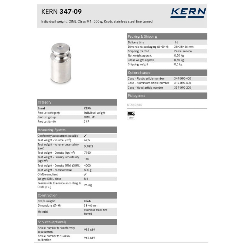 Individual weight, OIML Class M1, 500 g, Knob, stainless steel fine turned
