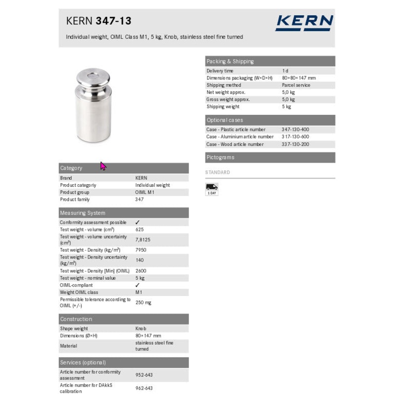 Weight OIML class M1 Shape weight Knob Material stainless steel fine turned Test weight – nominal value 5 kg Permissible tolerance according to OIML (+/-) 250 mg GTIN/EAN number 4045761008878
