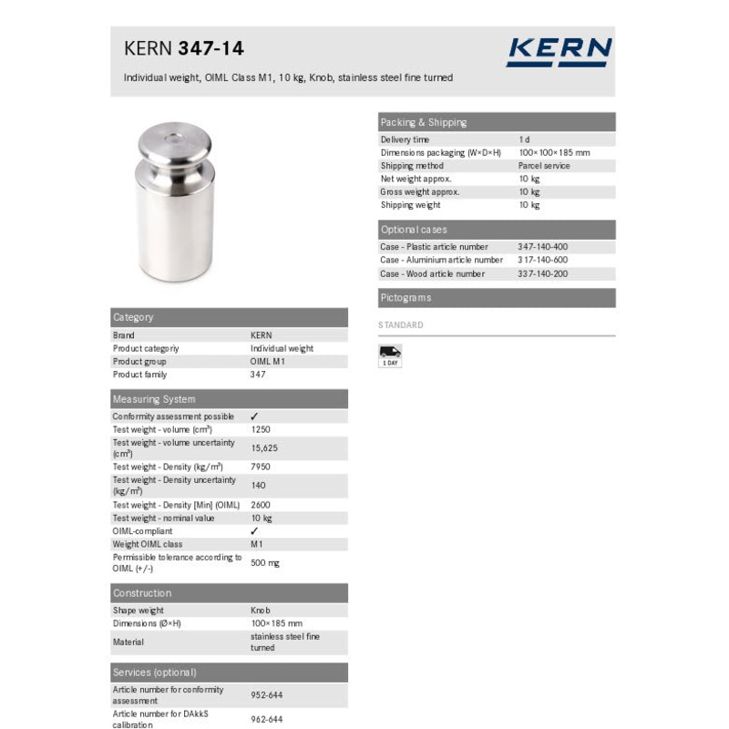 Weight OIML class M1 Shape weight Knob Material stainless steel fine turned Test weight – nominal value 10 kg Permissible tolerance according to OIML (+/-) 500 mg GTIN/EAN number 4045761008892