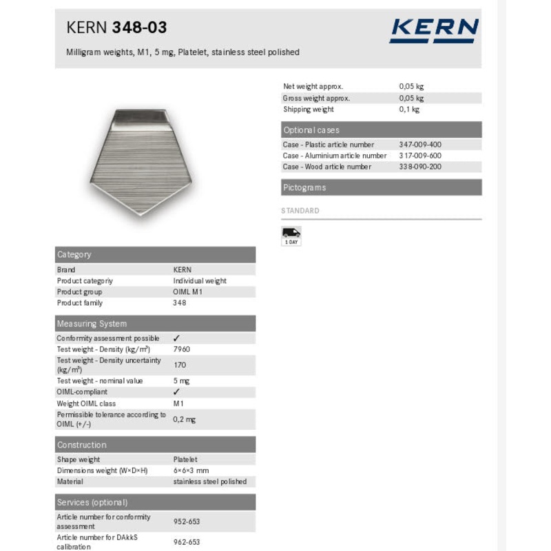 Milligram weights, M1, 5 mg, Platelet, stainless steel polished