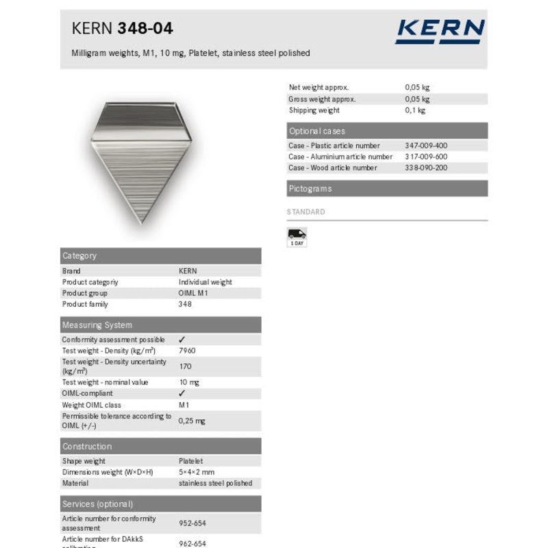 Milligram weights, M1, 10 mg, Platelet, stainless steel polished