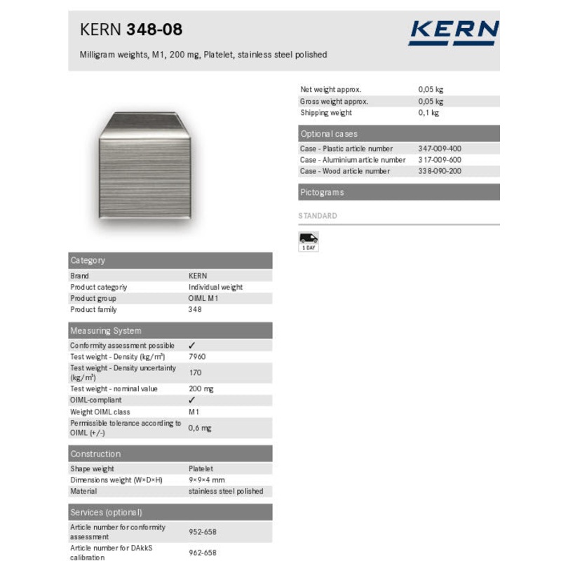 Weight OIML class M1 Shape weight Platelet Material stainless steel polished Test weight – nominal value 200 mg Permissible tolerance according to OIML (+/-) 0,6 mg GTIN/EAN number 4045761240209