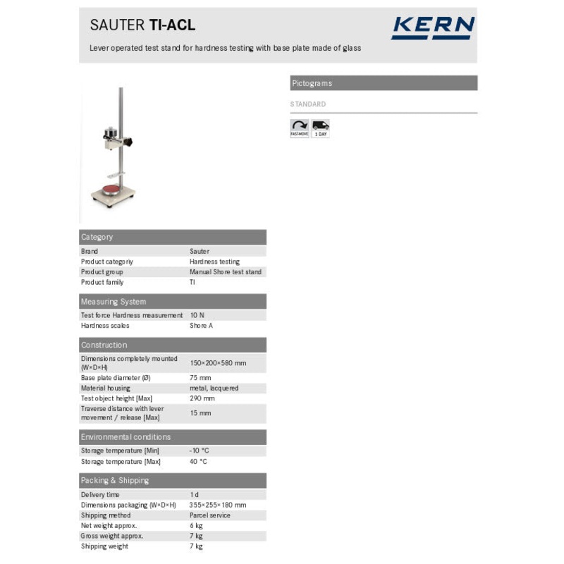 Hardness scales Shore A Test force Hardness measurement 10 N Material housing metal, lacquered Dimensions completely mounted (WDH) 150200580 mm Test object height [Max] 290 mm Product family TI -