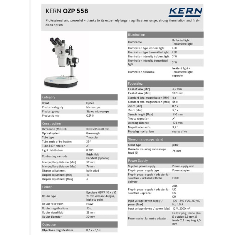- The KERN OZP stereo zoom microscope stands out through its above-average magnification range and its robust shape which is also ergonomic, it enables effortless, simple working over a period of several hours