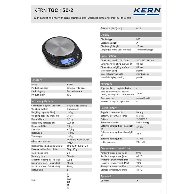 Weighing capacity [Max] 150 g Weighing capacity [Max] (ct) 750 ct Readability [d] 0,01 g Readability carat [d] (ct) 0,05 ct Units g, gn, dwt, ozt, ct, oz Linearity 0,3 g Reproducibility 0,2 g Stabilization time 2 s Adjustment options Adjusting with external weight Recommended adjusting weight 50 g (M2); 100 g (M2) Ambient temperature 0 C 40 C Dimensions weighing surface () 81 mm Material housing plastic Dimension housing (WDH) 10013018 mm Material weighing plate stainless steel Net weight approx. 0,20 kg Construction type of the scale Single-range balance GTIN/EAN number 4045761217522