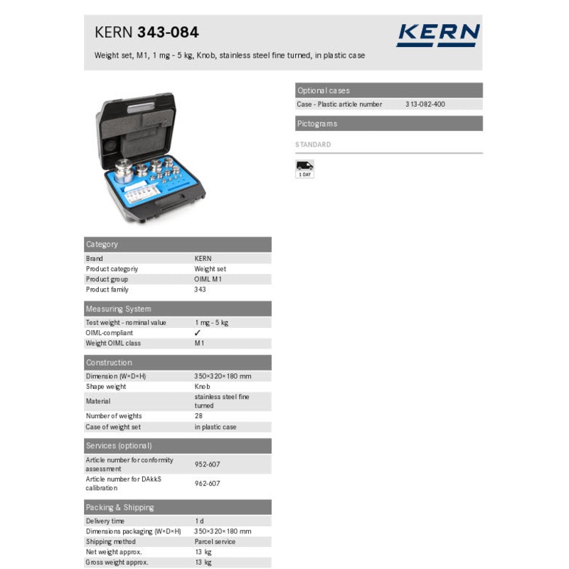 Weight set, M1, 1 mg – 5 kg, Knob, stainless steel fine turned, in plastic case