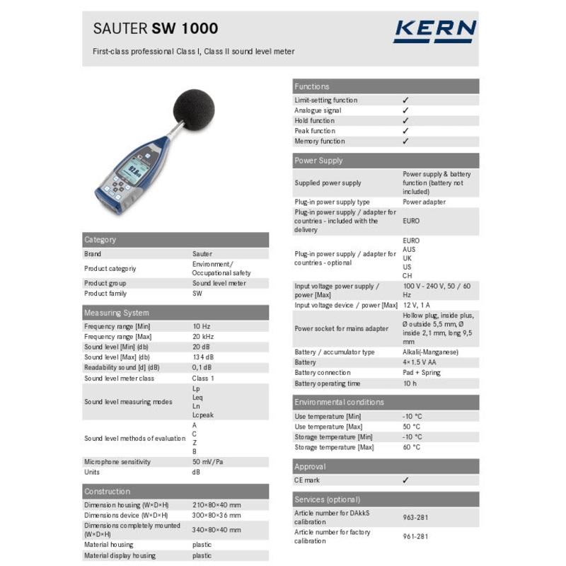 Measuring range Sound 20 dB 134 dB Readability sound [d] (dB) 0,1 dB Units dB Sound level measuring modes Lp, Leq, Ln, Lcpeak Sound level methods of evaluation A, C, Z, B Frequency range 10 Hz 20 kHz Memory function Hold function Peak function Limit-setting function Microphone sensitivity 50 mV/Pa Battery 41.5 V AA Material housing plastic Dimensions completely mounted (WDH) 3408040 mm Product family SW