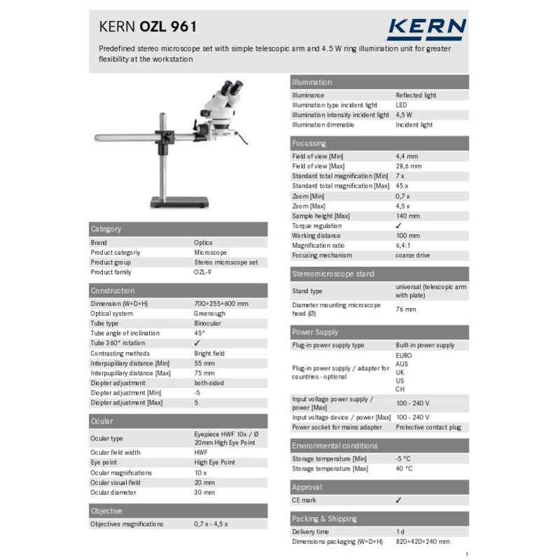 Predefined stereo microscope set with simple telescopic arm and 4.5 W ring illumination unit for greater flexibility at the workstation