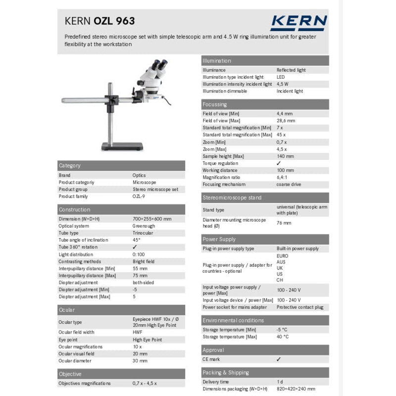 Predefined stereo microscope set with simple telescopic arm and 4.5 W ring illumination unit for greater flexibility at the workstation