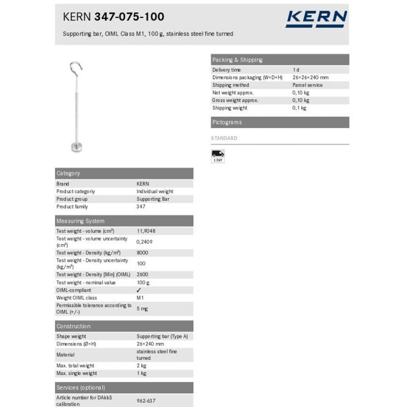 KERN Supporting bar 347-075-100, OIML Class M1, Nominal value , Supporting bar, Aluminium 100g Beam, Max load 2kg