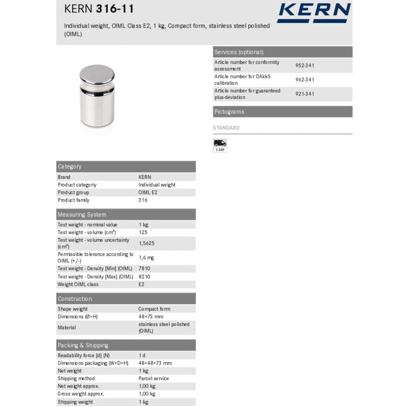 KERN Test weight 316-11OIML Class E2, Nominal value 1kg, Platelet, Stainless Steel polished