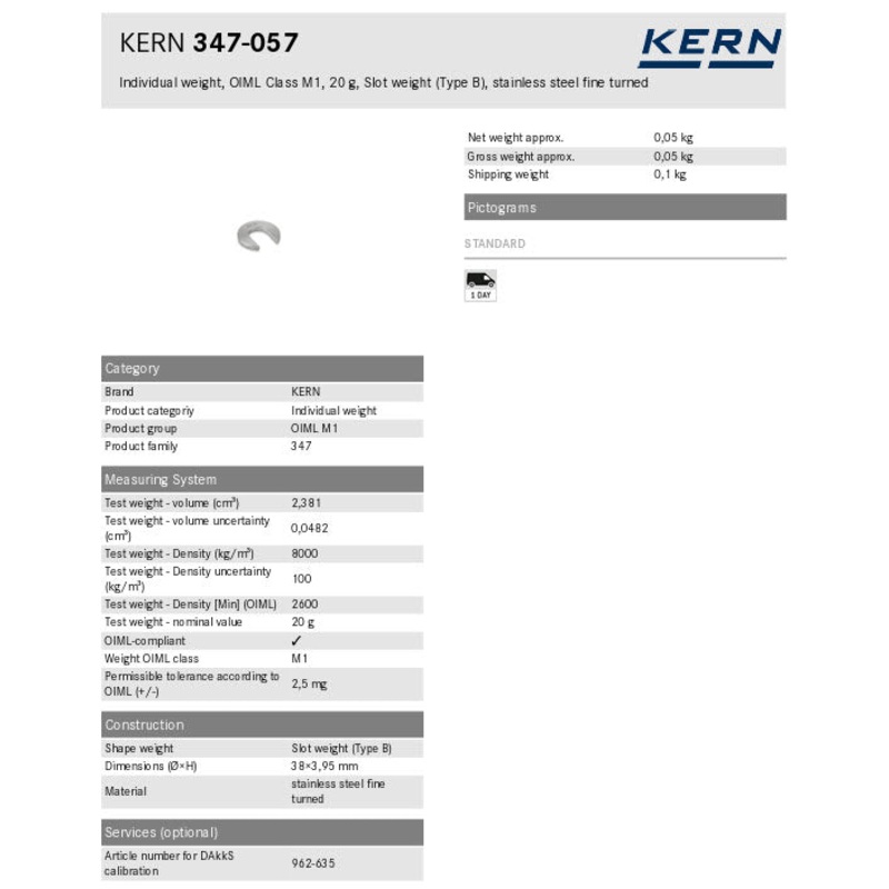 Individual weight, OIML Class M1, 20 g, Slot weight (Type B), stainless steel fine turned