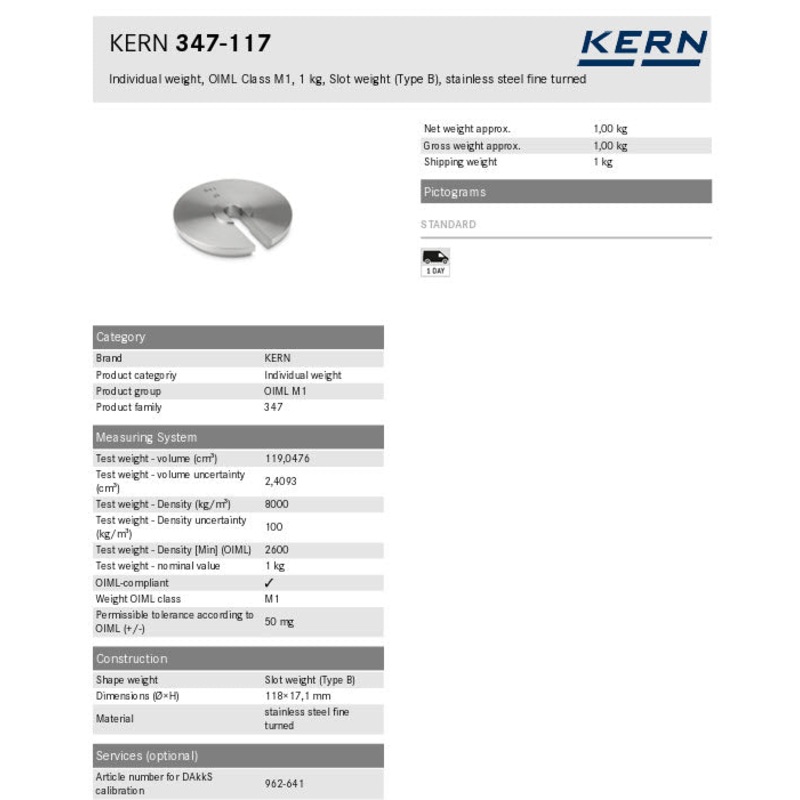 Individual weight, OIML Class M1, 1 kg, Slot weight (Type B), stainless steel fine turned