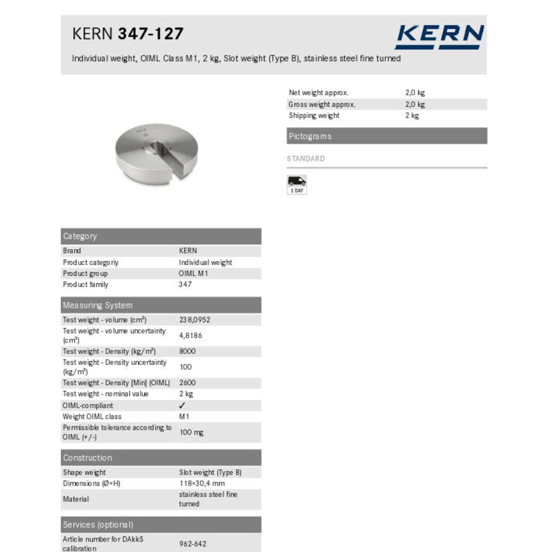 Individual weight, OIML Class M1, 2 kg, Slot weight (Type B), stainless steel fine turned