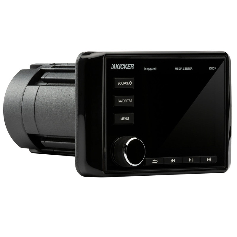 Tons more fun for your cruise! KICKERs premier KMC5 Media Center features six channels of built-in power, delivering up to 240 watts to your speakers! Equipped with an AM/FM/satellite/weather-band tuner, charging USB connection, and four sets of RCA outputs for easy expansion. Includes RGB LED trim ring, and chrome and black trim bezels.