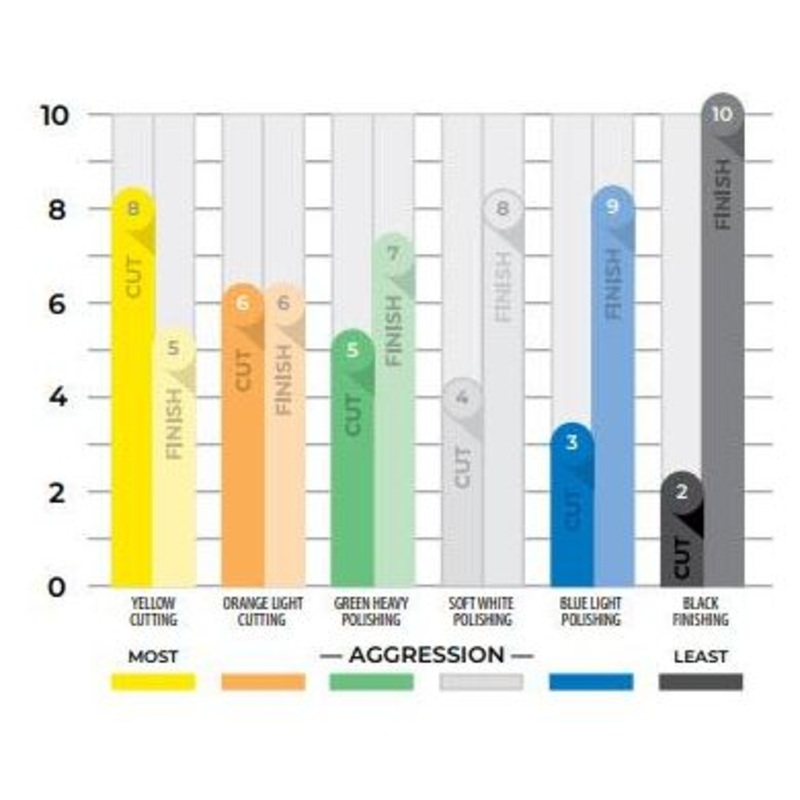 These aggressive pads will most often require additional polishing to remove any compounding haze or “buffer trails” inflected from the heavy foam.