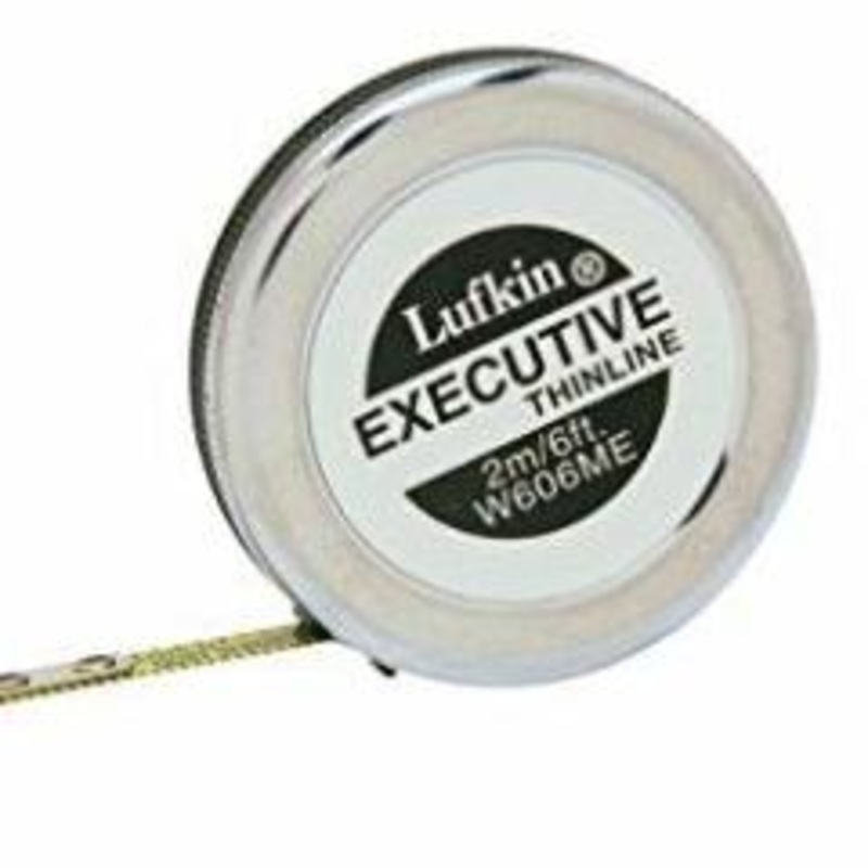 Lufkin Executive Thinline Pocket Tape, 6’/2m, Model W606ME Convenient pocket-sized tape has a chrome case, steel yellow blade, and textured edges for easy handling. The top edge is graduated in 16ths and numbered consecutively in inches. The bottom edge is graduated in millimeters and numbered every 10th millimeter. 1/4″W x 6′ (2m) L blade.