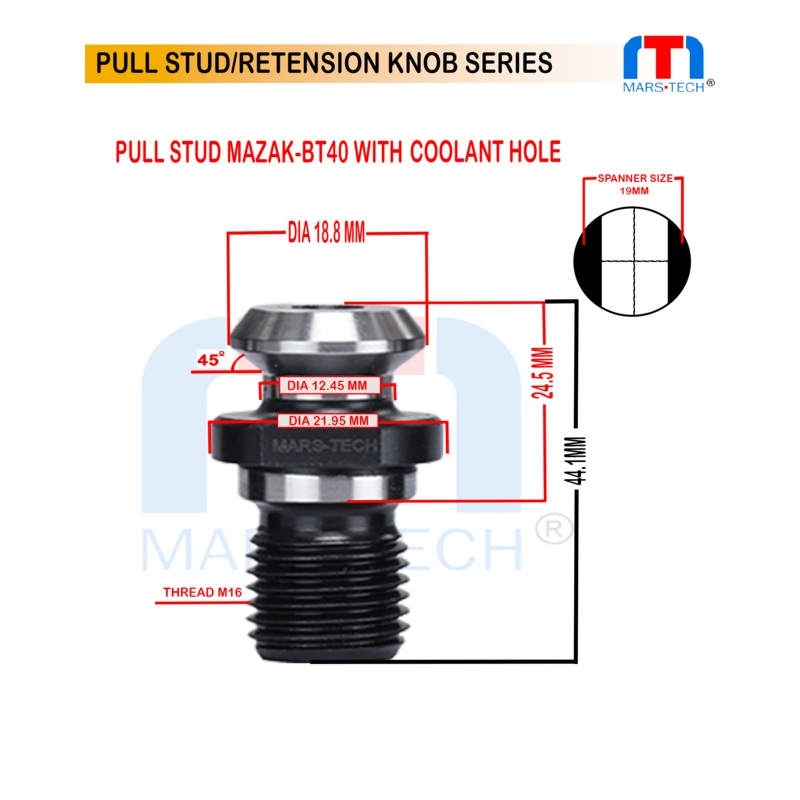 Mazak BT40 SK40 Pull stud used in CNC machines for BT40 holders ISO standard name is MAS403 Pull studs are an important link between machine and tool. The requirements concerning accuracy, rigidity and reliability are very high. Pull studs of minor quality not only decrease the performance of the machine, they are even a safety risk. A breaking pull stud might cause severe damage on machine and workpiece and even injuries on persons. made of special steel for higher rigidity proper heat treated ,