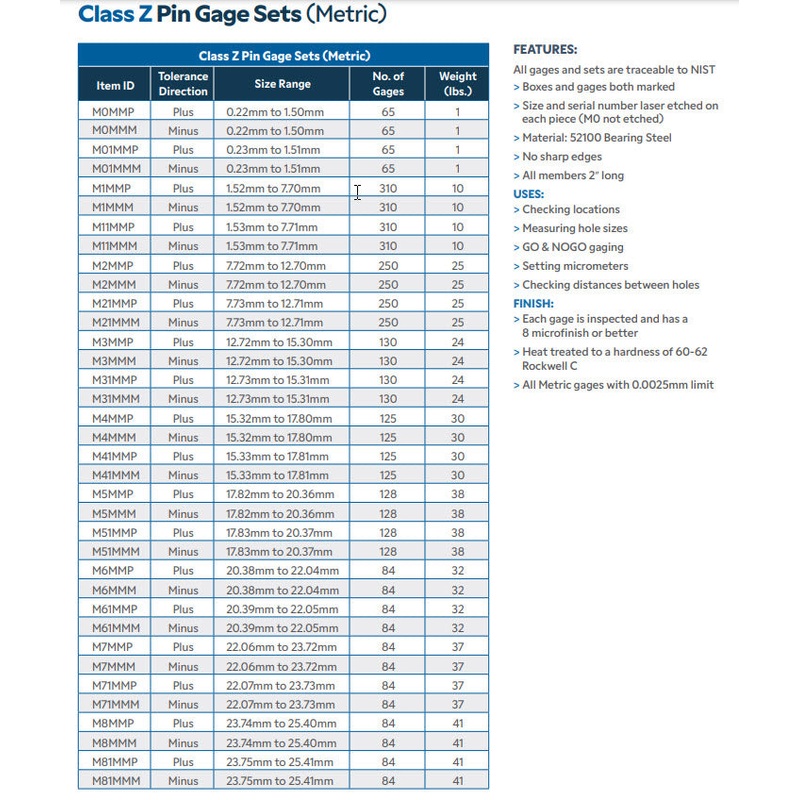 Meyer Pin Gauge sets MOMMM .22-1.5mm x.02mm, Minus Tolerance