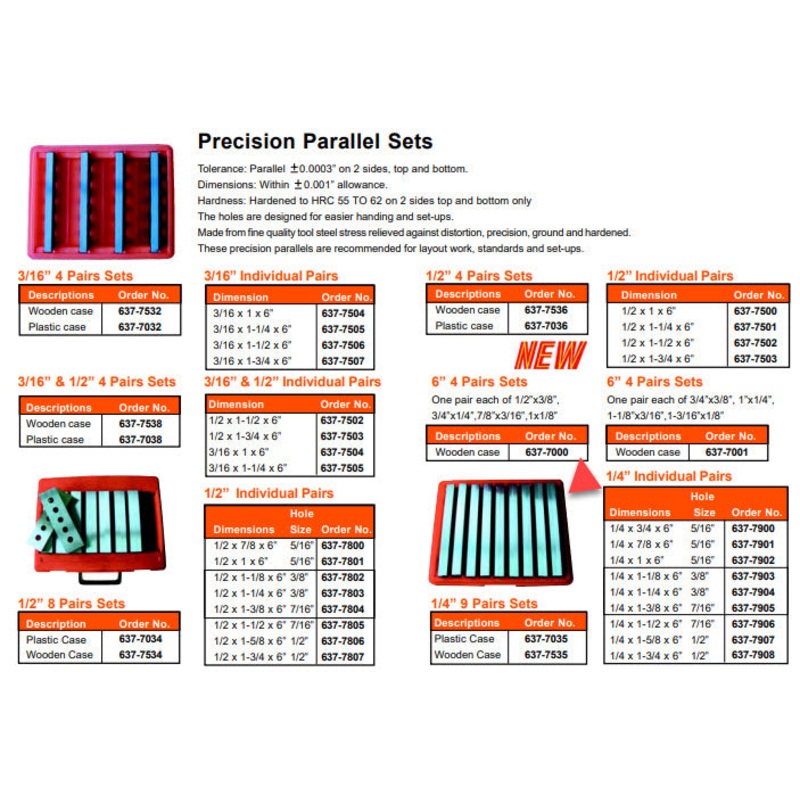 MHC 637-7000 Sets of Parallels 4 Pairs of parallels 6 Sizes1/2x 3/8, 3/4 x 1/4, 7/8 x 3/16, 1 x 1-1/8