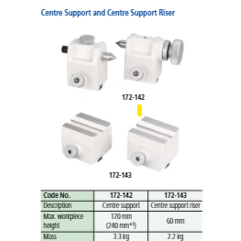 Mitutoyo 172-142 Series 172 Centre Support Description : Centre Support Max. Workpiece Diameter : 120mm/4.7 240mm/9.4*When using Centre Support Riser Mass : 3.3kg Remarks :