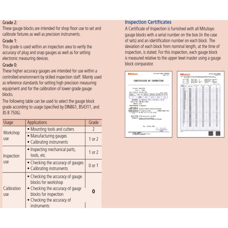 A Mitutoyo gauge block set with all blocks made of zirconia ceramic. This is the hardest gauge block material and gives the best wear resistance combined with least secular change and has an expansion coefficient which closely matches that of steel. Excellent inter-set wringing properties and will wring to optical flats or gauge blocks made of any other material.