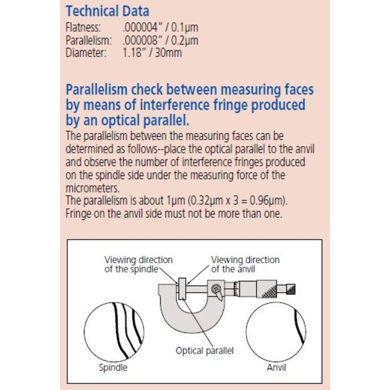 A Mitutoyo outside micrometer test set comprising ten gauge blocks for testing accuracy throughout measuring stroke and an optical parallel for testing contact face flatness and parallelism.