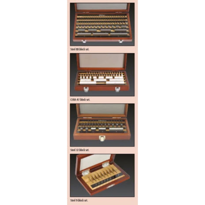 A gauge block set with all blocks made of special tool steel, heat treated and aged to give good wear resistance and small secular change. Excellent inter-set wringing properties and will wring to optical flats or gauge blocks made of any other material.