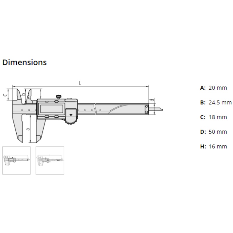 A Mitutoyo digital caliper equipped with standard outside and inside jaws. Hardened stainless steel construction and equipped with ABSOLUTE System scale for error free, high-speed measurement. SPC data output.