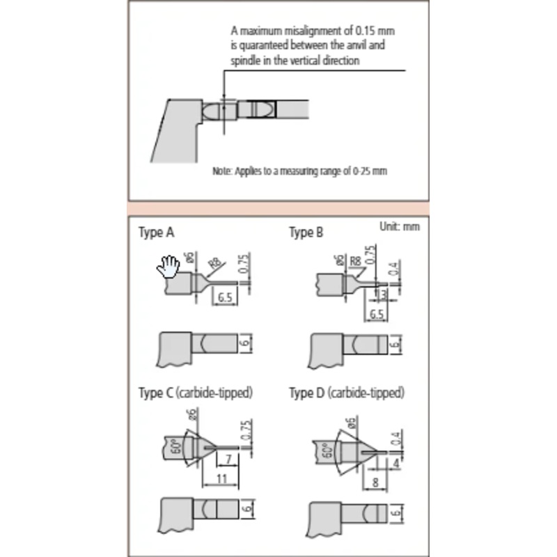 Measuring face: Carbide-tipped or hardened steel spindle and anvil