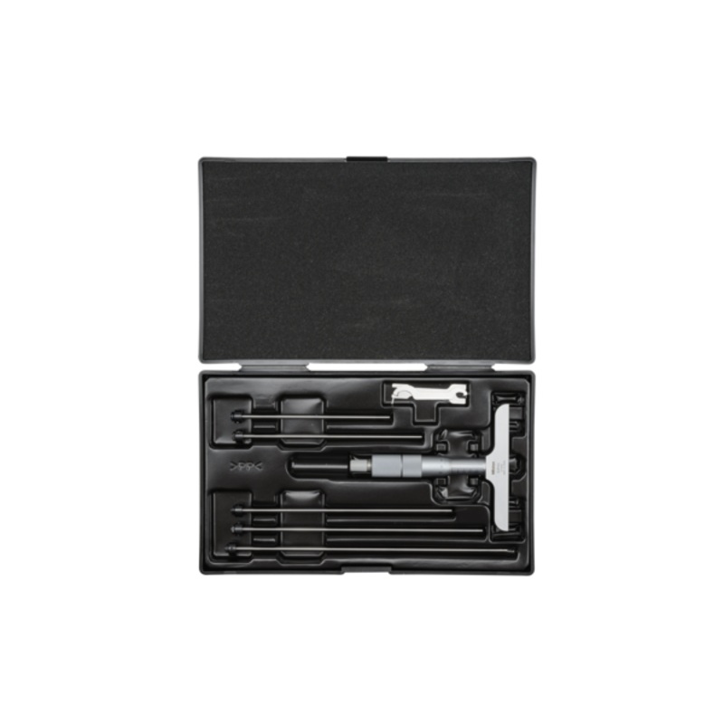 A Mitutoyo non-digital depth micrometer using interchangeable measuring rods to cover a wide measuring range. The 100mm base is made from tool steel, hardened and ground with a micro-lapped reference surface.