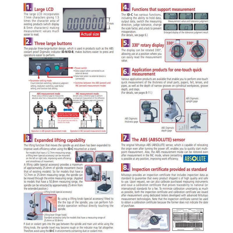 Style of Indicator Standard Type Digital Measurement units Metric Mounting Diameter 8mm Measuring Range 12.7mm Resolution .001mm/.01mm SPC Output Yes Accuracy .003mm Back Flat Digital, Non-Digital Digital Measuring Force 1.5N