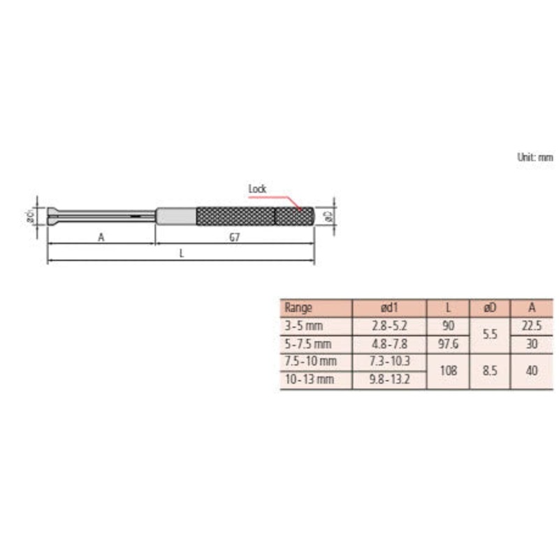 • Designed to be locked in position (with knurled lockscrew) and the diameter measured across the two lobes with a micrometer after withdrawal from the hole