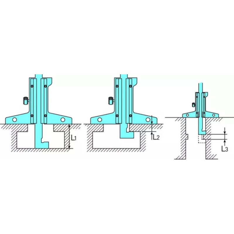 • The end of the beam is hook-shaped so you can take depth and thickness measurements of a projected portion or lip in a hole, as well as standard depth measurements.