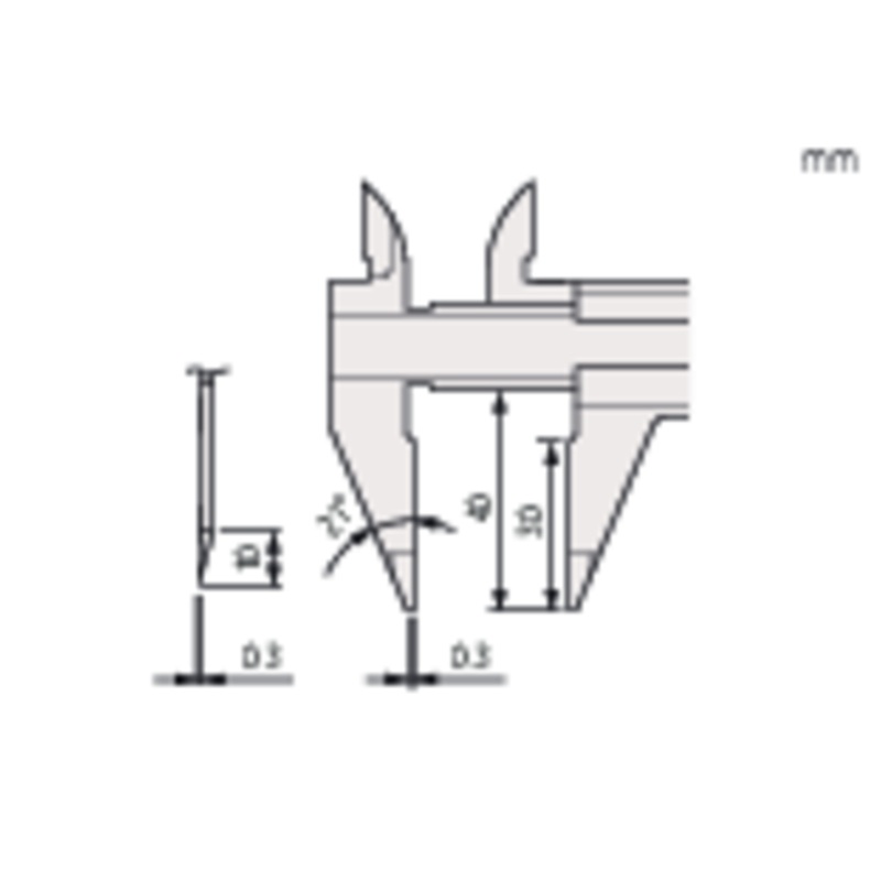 A Mitutoyo vernier caliper equipped with special pointed jaws for accessing very small grooves and tracks. Hardened stainless steel construction with easy-to-read, satin-chromed scales.